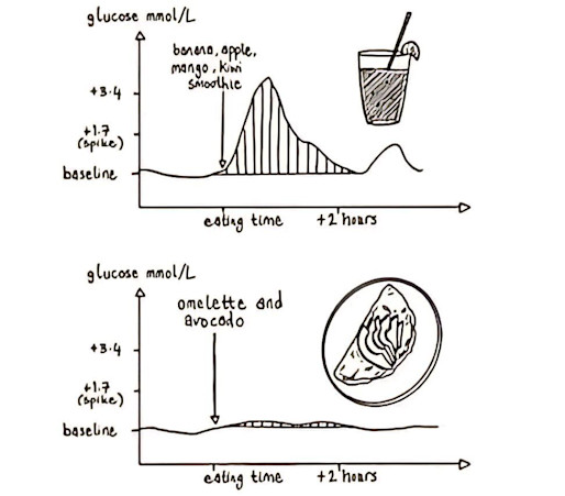 Jessie Inchauspe, a French biochemist and writer, in her book "Glucose Revolution" shows on a graph how glucose levels change if you eat a sweet smoothie breakfast with banana, apple, mango and kiwi (upper graph), and how sharp the situation changes if you have omelet with avocado.